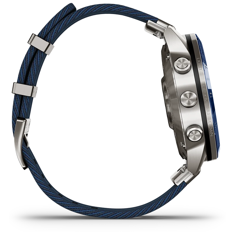 Den 46 mm stora boetten i fiberförstärkt polymer kombineras med kupat safirglas och en fantastisk AMOLED-skärm som ger maximal läsbarhet i alla miljöer. Den blå tavelringen och det jacquardvävda textilarmbandet ger ett sportigt, nautiskt uttryck samtidigt som konstruktionen är gjord för att tåla tuffa marina förhållanden. Trots sin kraftfulla funktionalitet väger klockan endast 87 gram, vilket gör den bekväm att bära hela dagen.
