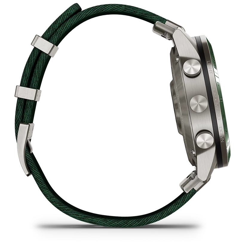 Den robusta boetten i fiberförstärkt polymer matchas med en sofistikerad grön tavelring som direkt för tankarna till golfens värld. Det gröna textilarmbandet är tåligt, bekvämt och skapat för att sitta stabilt under hela rundan. Under det kupade safirglaset sitter en briljant AMOLED-skärm som visar statistik, kartor och notifikationer med fantastisk tydlighet. Med en vikt på endast 87 gram är den lätt att bära även under långa och intensiva spelpass.